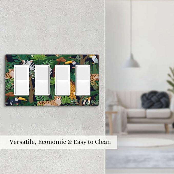 Cartoon Animal Zebra Leopard Giraffe Bird Leaf 4 Gang Rocker Decora Nursery Light Switch Cover Decorative Outlet Covers Wall Plate Electrical Faceplate Switchplate GFCI for Kidroom Decor