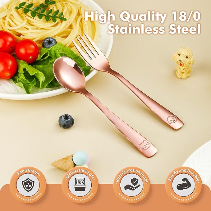 - [SAFER & CONVENIENCE DINING] - Crafted from 100% premium 18/0 stainless steel, these utensils ensure your child's safety with non-toxic, rust-free materials. The sturdy and enduring design ensures these cutlery grow alongside your child. Enjoy effortless cleaning with these dishwasher-safe silverware, allowing you more quality moments with your little one, as cleanup becomes a breeze.
