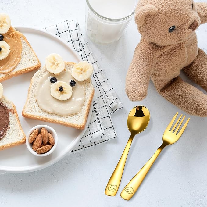 - [DESIGNED FOR LITTLE HANDS] - Our ergonomically crafted handles ensure a cozy grip for tiny fingers. With smooth edges, a mirror-polished finish, short, rounded tines, and a perfectly sized spoon, these utensils effortlessly guide food to the mouth. Say goodbye to accidental stabs, ensuring a secure and comfortable self-feeding experience. Instill confidence in your child's eating journey, knowing they're equipped with the best tools for the job.