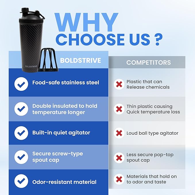 - Insulated Metal: Our protein shake bottle is made of high-quality 304 stainless steel. The protein bottle also has a 100% BPA free plastic lid, keeping your drinks cold and chemical free.