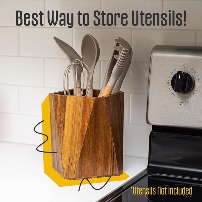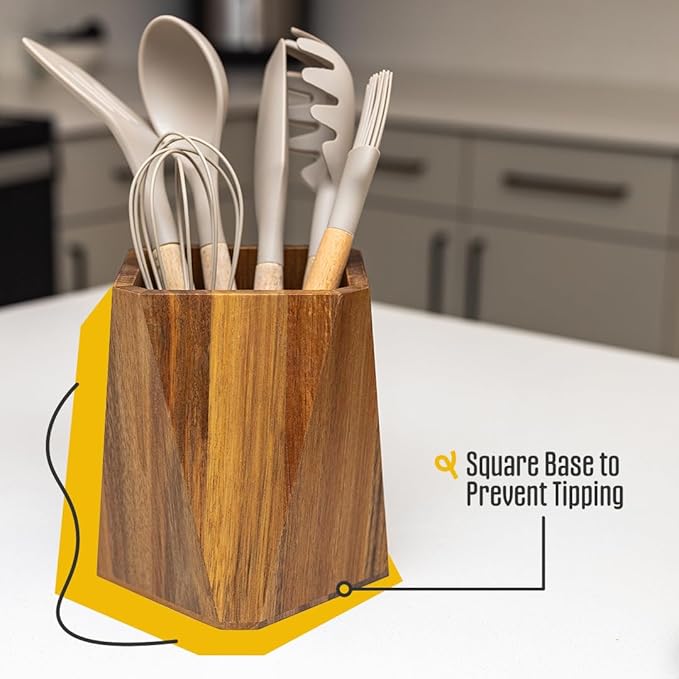 - Reliable Utensil Holder: Made from durable acacia wood, this wooden utensil organizer stands up to daily wear and moisture with ease. It's your trusty companion in the kitchen, designed to endure and elevate your kitchen accessories.