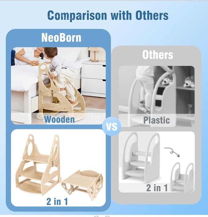 - 【2-in-1】Toddler step stool converts to a toddler’s desk, without any tools. The unique design with a backrest allows their child to eat and play independently. NeoBorn toddler step stool adds a bit of fun to your baby's development.