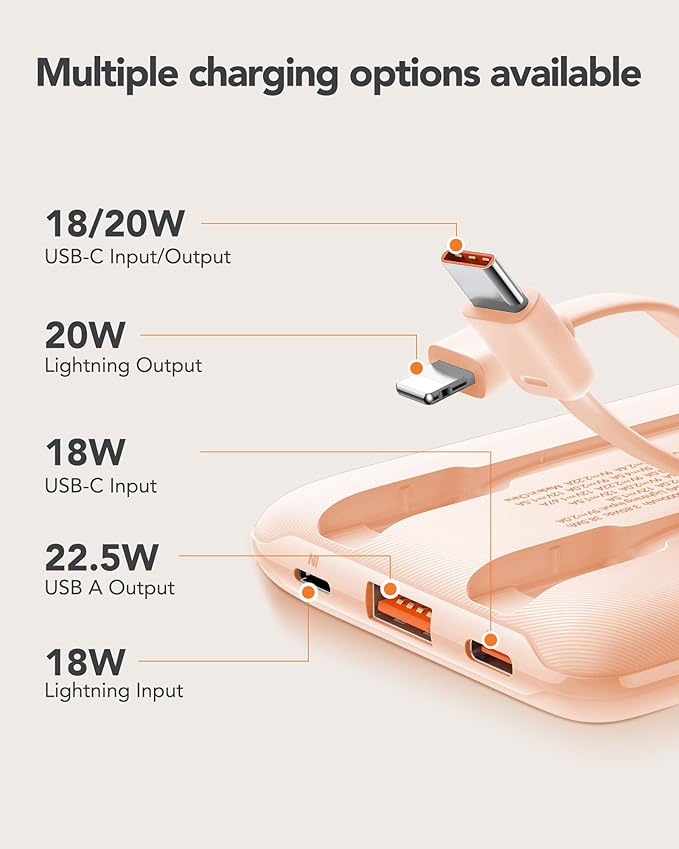 - [ Portable Battery with Dual USB-C Recharging ] This slim portable charger USB C offers two recharging methods: You can conveniently charge the battery pack by plugging the built-in USB-C cable into a USB base. Alternatively, you can use a conventional method by inserting an additional USB-C charging cable into the USB-C port on the battery bank. Additionally, this power bank supports pass-through charging, allowing you to charge your devices while recharging the power bank itself