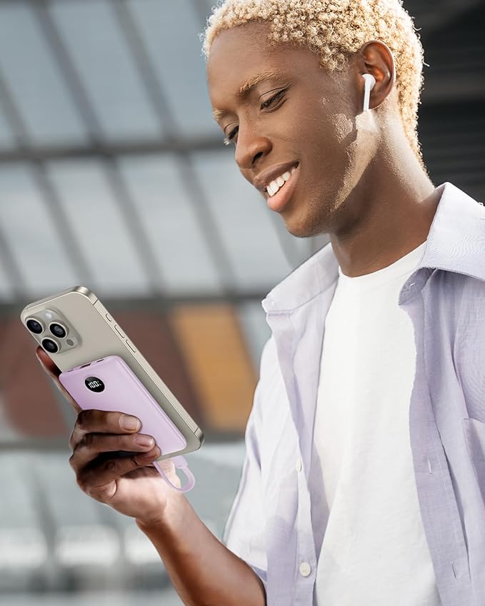 - [ Portable Battery with Dual USB-C Recharging ] This slim portable charger USB C offers two recharging methods: You can conveniently charge the battery pack by plugging the built-in USB-C cable into a USB base. Alternatively, you can use a conventional method by inserting an additional USB-C charging cable into the USB-C port on the battery bank. Additionally, this power bank supports pass-through charging, allowing you to charge your devices while recharging the power bank itself