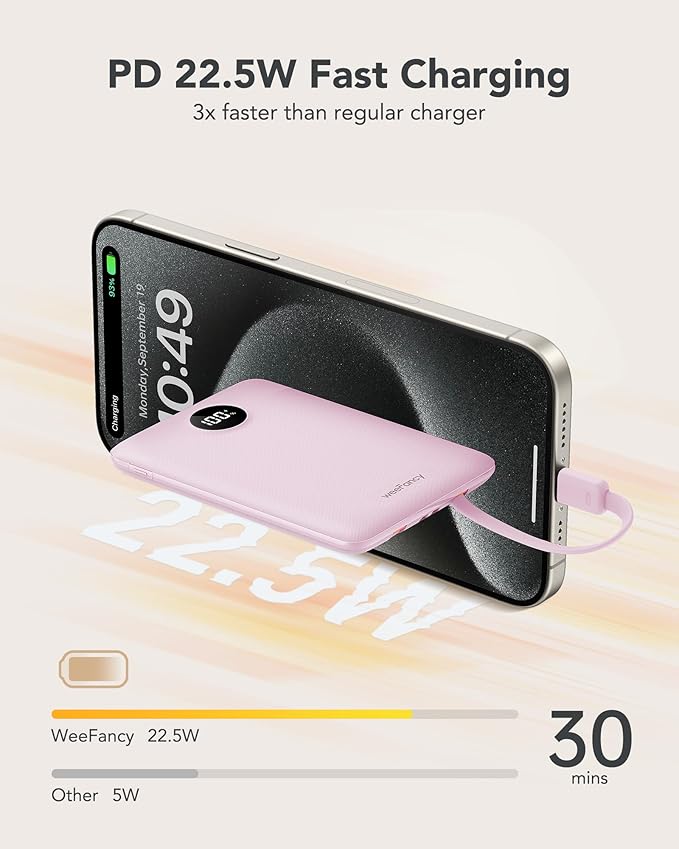 - [ PowerBank Fast Charging ] This USB C power bank featuring PD 3.0 and QC 3.0 fast charging protocols, delivers up to a maximum of 22.5W output, charging the iPhone 15 from 0% to 45% in just half an hour, 3x faster than other chargers. Using the built-in USB C input cable of the portable power bank, the fast charging battery bank itself recharges from 0% to full charge in only 3 hours