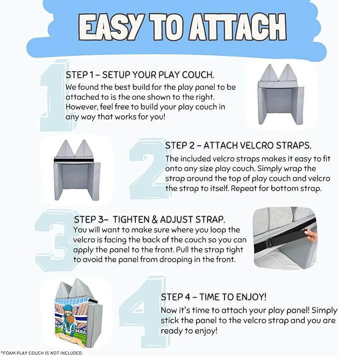 - MADE FOR EVERYONE - No couch? No problem! Our adjustable straps allow you to connect the play panels to any normal couch cushion or chair! **Play couch not included with purchase**