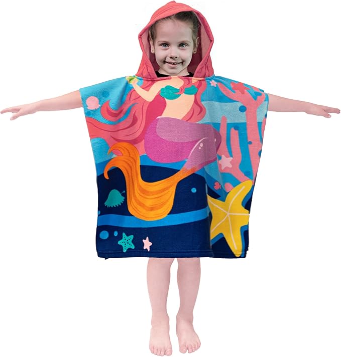 - 【Multi Uses】There's enough room to wrap around and cuddle up in. This poncho beach towels for kids are designed to dry their body or keep warm for kids, girls, and boys. It’s great for after the beach, pool, or bath, as well as to cover up before and after swim lessons. The size is 24"W x 24"L for kids around 27" to 46" height.