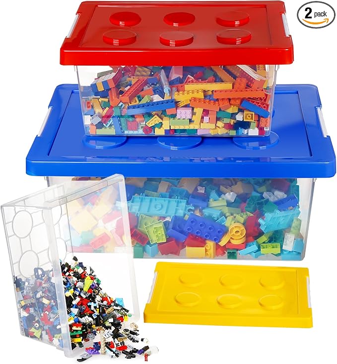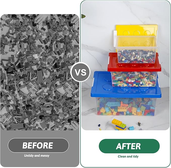 - ❤PERFECT DESIGN - Our toy storage bins are designed with compatible building base plates and lids. You can stack boxes of the same size like building blocks without sliding. Each lid is fastened tightly to the container through a snap design. The transparent container is clear at a glance, making it easy to distinguish different toys. Cultivate the habit of storing babies from an early age.