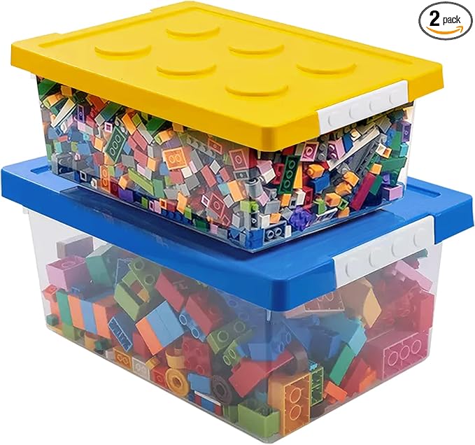 - ❤SET OF 2 STORAGE BINS - The package includes two different sizes toy storage organizer bins with lid. Large bin with blue lid: 14.4'' x 9.6'' x 6.5''; Small bin with yellow lid: 12'' x 8.1'' x 5.3''. Plastic bins for storage for kids are luxuriously selected high-quality PP material, without any harmful ingredients. Completely healthy and safe, your baby and family can use them with peace of mind.