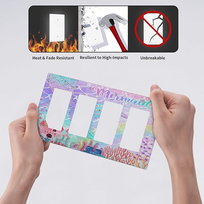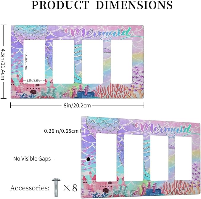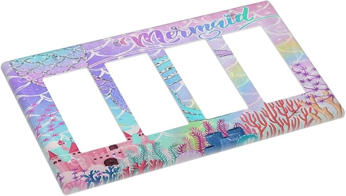Silvery Glitter Cute Mermaid Tail Fantasy Castle 4 Gang Rocker Decora Light Switch Cover Outlet Covers Wall Plate Decorative Switchplate Electrical Faceplate GFCI for Kidroom Nursery Bedroom Decor