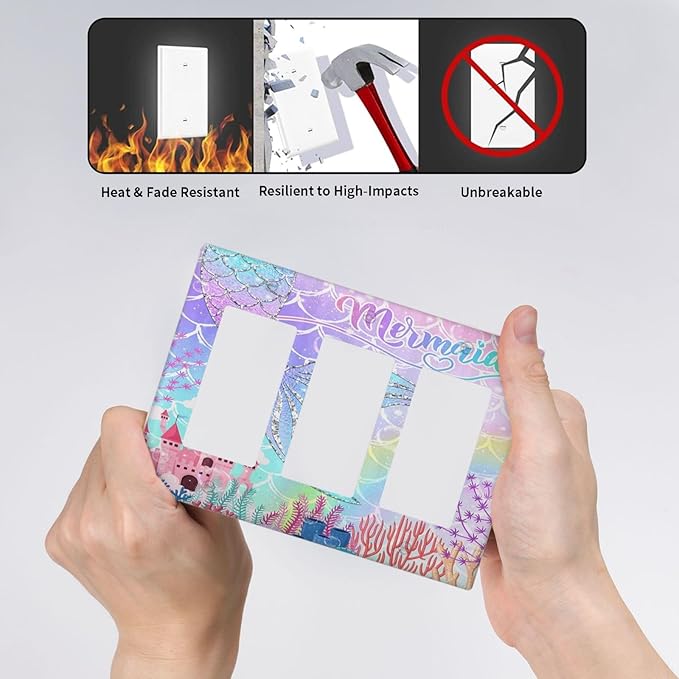 Silvery Glitter Cute Mermaid Tail Fantasy Castle 3 Gang Rocker Light Switch Covers Triple Outlet Wall Plate Decorative Switchplate Cover Faceplate GFCI for Kidroom Nursery Bedroom Kitchen Decor