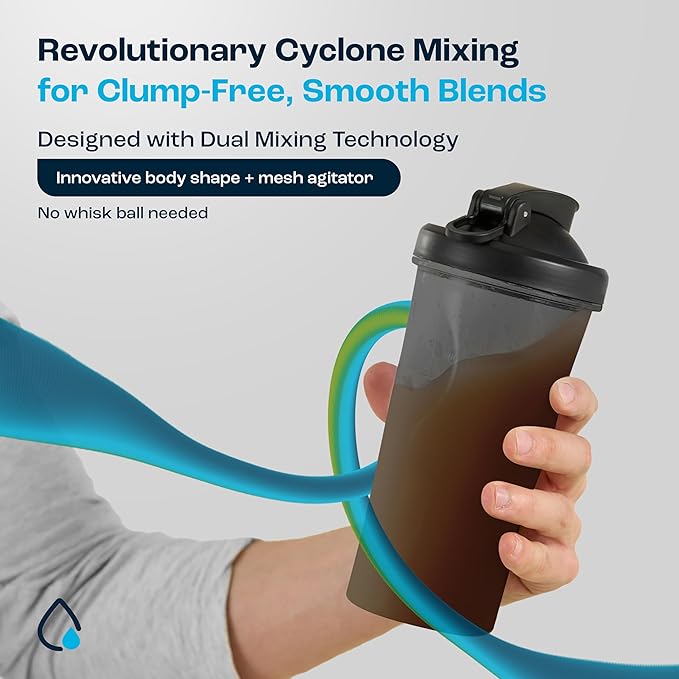- Revolutionary Dual Mixing Technology - The Aquafit Protein Shaker Bottle's innovative shape, paired with a mesh agitator, creates a cyclone effect for smoother blends. No need for whisks and shaker balls—we designed this protein shake bottle to prevent clumps in protein shakes, smoothies, pre-workout mixes, and powder supplements.