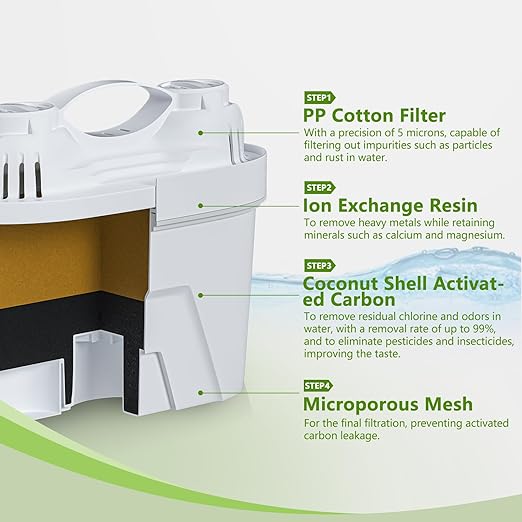 - Efficient Filtration -- Our water filter pitcher features a four-stage filtration system that removes 2000% more contaminants than ordinary activated carbon filters. It effectively filters out harmful substances such as lead, chlorine (taste and odor), cadmium, mercury, benzene, asbestos, microplastics, total trihalomethanes, chromium 6, fluoride, chloramines, and more.