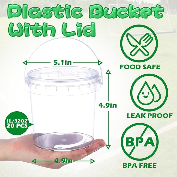 - Size Information: these plastic buckets with handles measure approx. 5.1 x 4.9 x 4.1 inches/ 13 x 12.4 x 10.5 cm, and with a capacity of 1 liter about 32 oz, enough for your daily use, also coming with 4 packs of soccer stickers, 50 sheets per pack, a total of 200 pieces