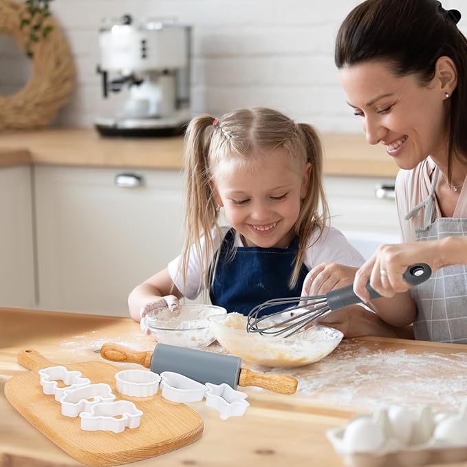 - 🧒REAL COOKING SET DESIGN FOR KIDS - This baking set for kids is safe for all ages, protecting our little chef's fingers from cutting. These kids' baking supplies are easy to use. They have convenient handles and soft edges. The kids cutting knives, wooden chopper, and cutting board are designed with rounded tips and edges. The cookie cutters are made of plastic in case the master chef cuts the fingers. Let them enjoy the bakers joy!