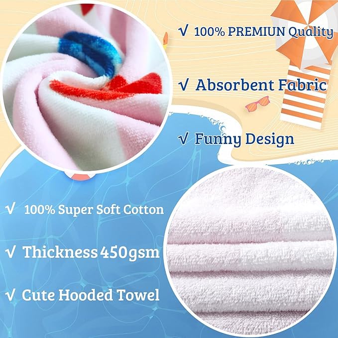 - Ideal Size:Measuring 28"x58" in full length and 28"x29" when folded, with a 10, 5"x10" hood, this kids' hooded bath towel is perfect for both kids and growing toddlers aged 4 to 8 years old
