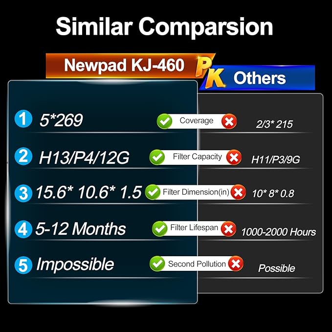 - Durable Replacement Filter - Different from others' small and poor filters with 1000-2000 hours of service life, our filter can last at least five months even if you run it 7/24, or even a year if you make a reasonable schedule with the app. Search 'B0BJZPMW53' or 'newpad replacement filter for KJ-300L' to get the official replacement filter.