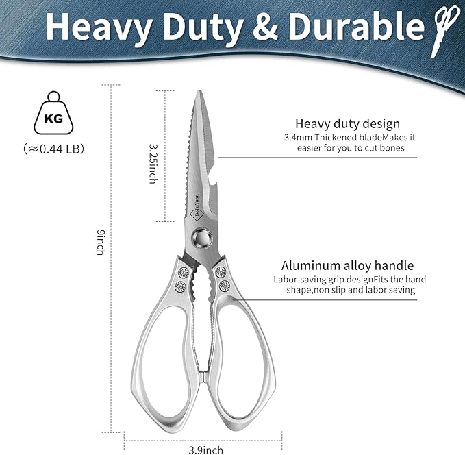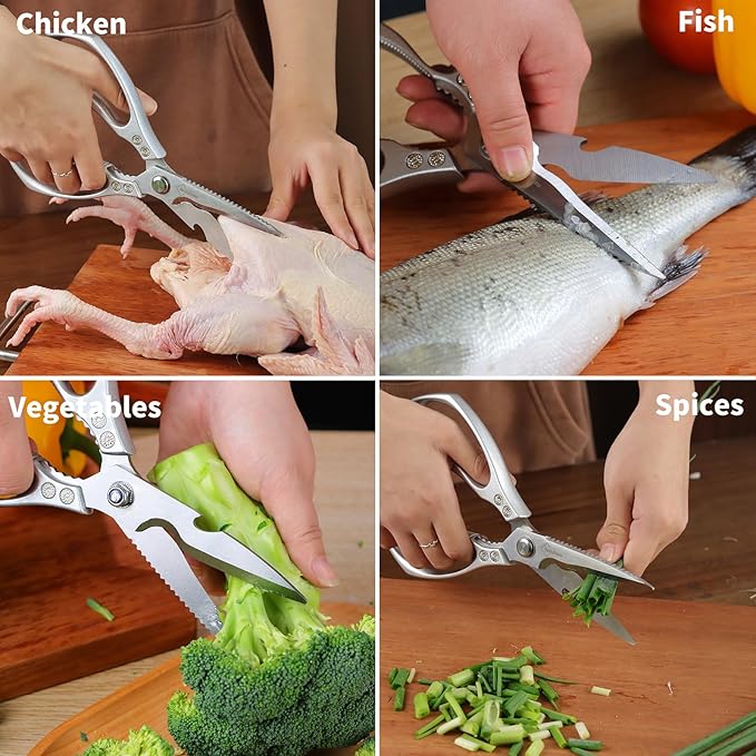 - MULTIPURPOSE KITCHEN SHEARS FOR FOOD: Ideal for cutting bone, chicken, meat, vegetables, and hard packaging; essential tool for chefs