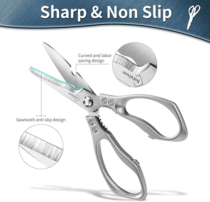 Kitchen Shears for Food Heavy-Duty: Multipurpose Kitchen Shears for Cutting Chicken, Bone, Meat, Food, (9'' Silver)