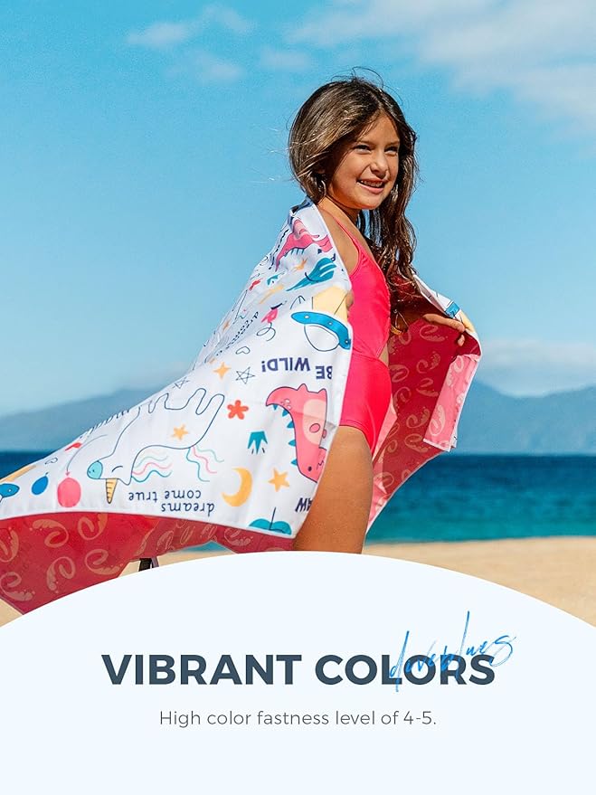 - 🌊Kid-Friendly & Colorful: Thanks to digital printing, colors stay vivid wash after wash. Your kids will love our signature double-sided prints and have twice the fun with them. High color fastness level of 4-5. Everyone needs a cute towel, especially kids. They can take their favorite towel to swimming, the beach, camping, hiking, picnics, pool parties, sleepovers, on vacation, and road trips.(Note: Wash before first use for increased softness.)