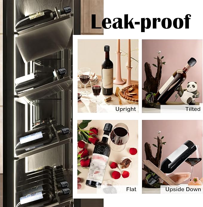 - Leak Proof. The cute wine stopper is leak proof whether the bottle is stored flat or upside down. The silicone wine stopper adds 0.3 inch to the bottle height when it locks the bottle. Suitable for wine fridge, bar, travelling and RV