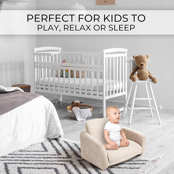 - Stylish 2-in-1 Convertible Feature: Your kids will simply love the beige colored kids sofa (recommended age: 18+ months)! The 22x16.5x15” kids couch delights with its double duty: easily switch from chair into a snug lounge position (22x41x11.5”)