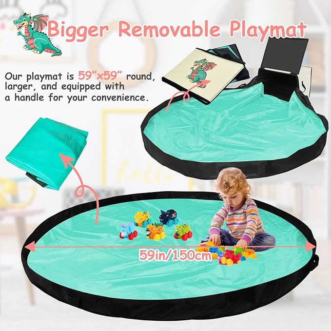 - 🚗 Larger than Normal Detachable Play Mat: Compared to other toy storage box with 43”x52” play mat, ours playmat is 59”x59” in round shape, much larger and comes with handles for your convenience use.