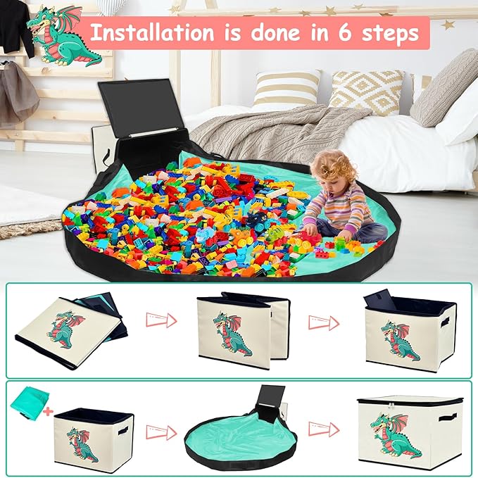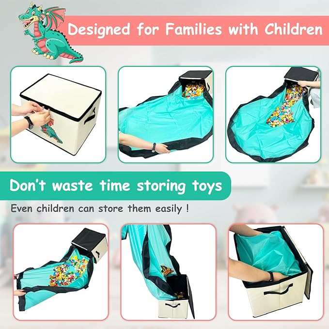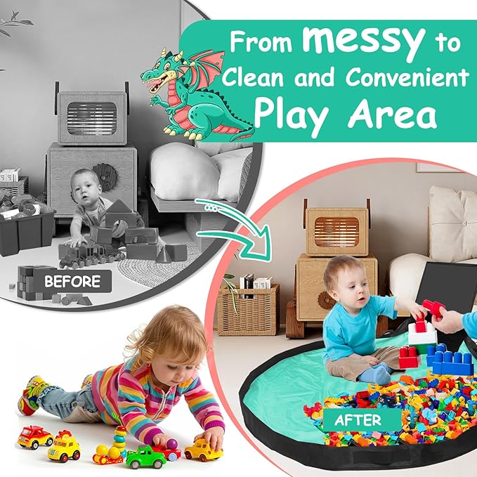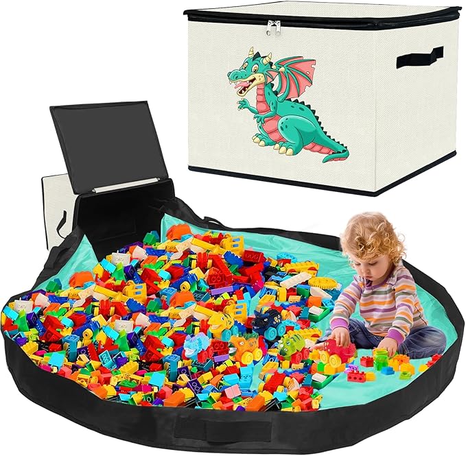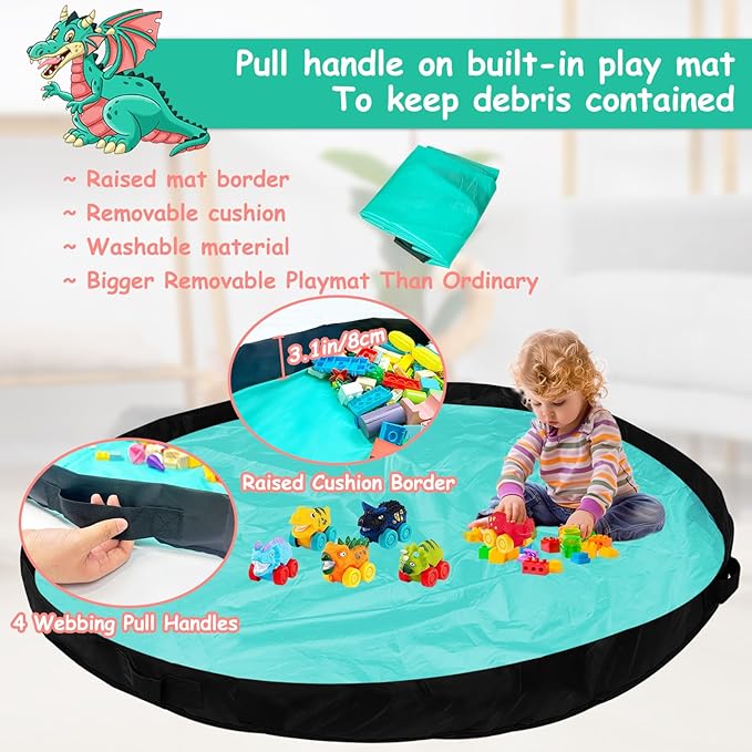 - 🚗 Clean Up in Seconds: You can effortlessly clean up your kids’ building blocks, bricks, puzzles and other small toys in seconds with this toy storage basket and play mat, just pull the handles on the built-in play mat to slide the mess away.