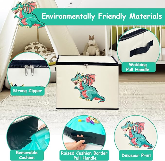 - 🚗 Durable, Foldable and Stackable: This dinosaur toy storage bag and play mat for boys and girls is made of thick cardboard and durable 300D oxford fabric, the lid is connected with box body with dual zippers in case of the inside toys come out.