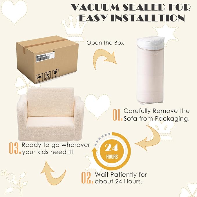 - ✿【VACUUM SEALED FOR NO INSTALLTION REQUIRED】➤ The toddler sofa couch is in vacuum packing. Simply unbox it and wait patiently for about 24 hours, then you will get a soft Sherpa Sofa for your kids. Remember to adjust it a little bit for a better looking. A THREE-YEAR WARRANTY is offered against manufacture's defect