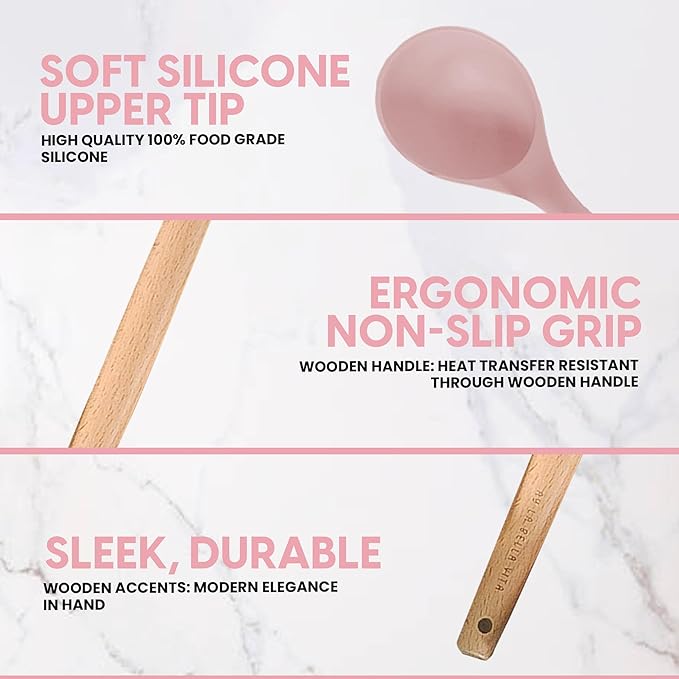 Silicone Utensil Set, 12 PCS Wooden Handle Nontoxic BPA Free 100% Food Grade Silicone Spoon Spatula Ladle Turner Tongs Kitchen Gadgets Utensil Set for Nonstick Cookware (Pink)