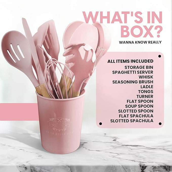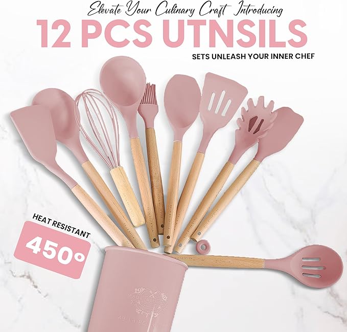 Silicone Utensil Set, 12 PCS Wooden Handle Nontoxic BPA Free 100% Food Grade Silicone Spoon Spatula Ladle Turner Tongs Kitchen Gadgets Utensil Set for Nonstick Cookware (Pink)