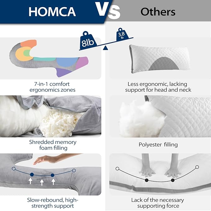 - 【Say Goodbye to Multiple Pillows】The HOMCA 7-in-1 memory foam body pillow is the ultimate solution for all your sleeping needs. It combines multiple pillow shapes into one, providing support for head, neck, belly, back, hips, knees, and feet. No more need for multiple pillows!