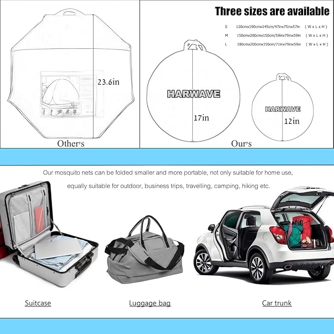 - - The mosquito net with its built-in high-quality elastic steel wire, no hooks or additional supports are required to keep the net standing. The steel wire is capable of bending 720 degrees freely and is resistant to rust and breakage. When folded, the mosquito net measures just 17 inches in diameter, easily fitting into a 24-inch suitcase. This makes it perfect for camping, travel, and business trips.