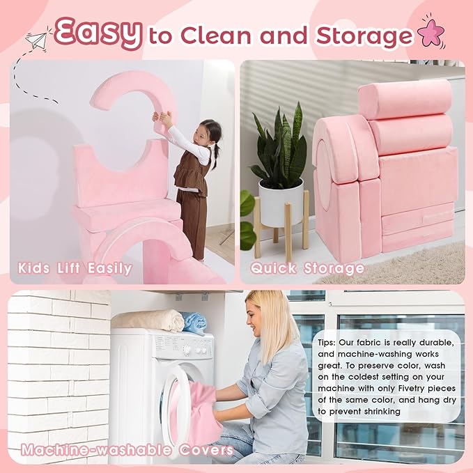 - [𝘿𝙪𝙧𝙖𝙗𝙞𝙡𝙞𝙩𝙮 & 𝙈𝙖𝙘𝙝𝙞𝙣𝙚 𝙒𝙖𝙨𝙝𝙖𝙗𝙡𝙚] - Kids love this play couch for its endless building possibilities, but parents love it for something else: easy to clean and durability! Machine-washable cover that can be removed for easy cleaning. The tear-resistant fabric won't fade and retains its original softness after multiple washings. The high-density foam won't collapse after prolonged use, providing long-lasting building hours for your kids.
