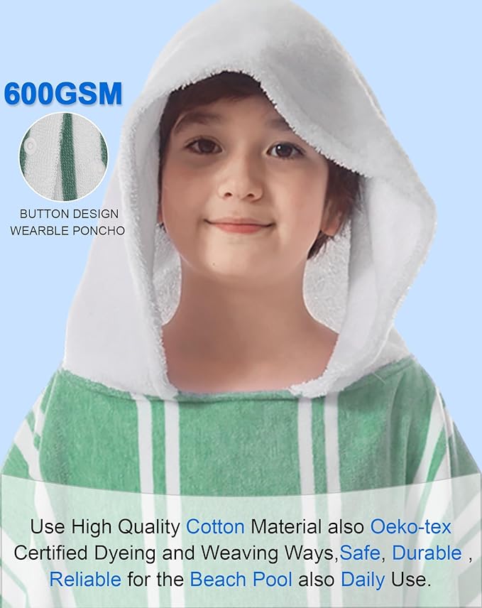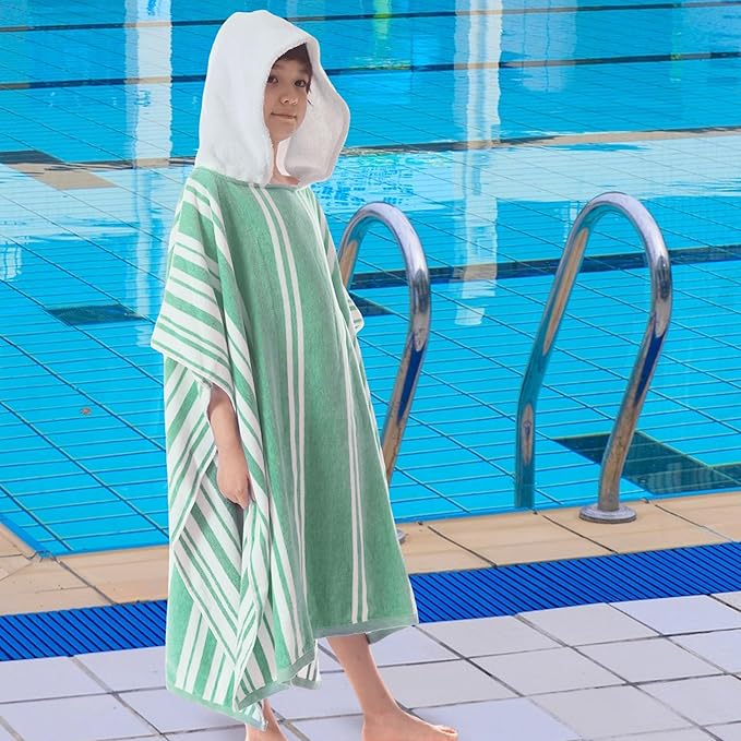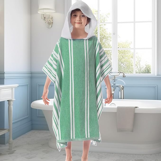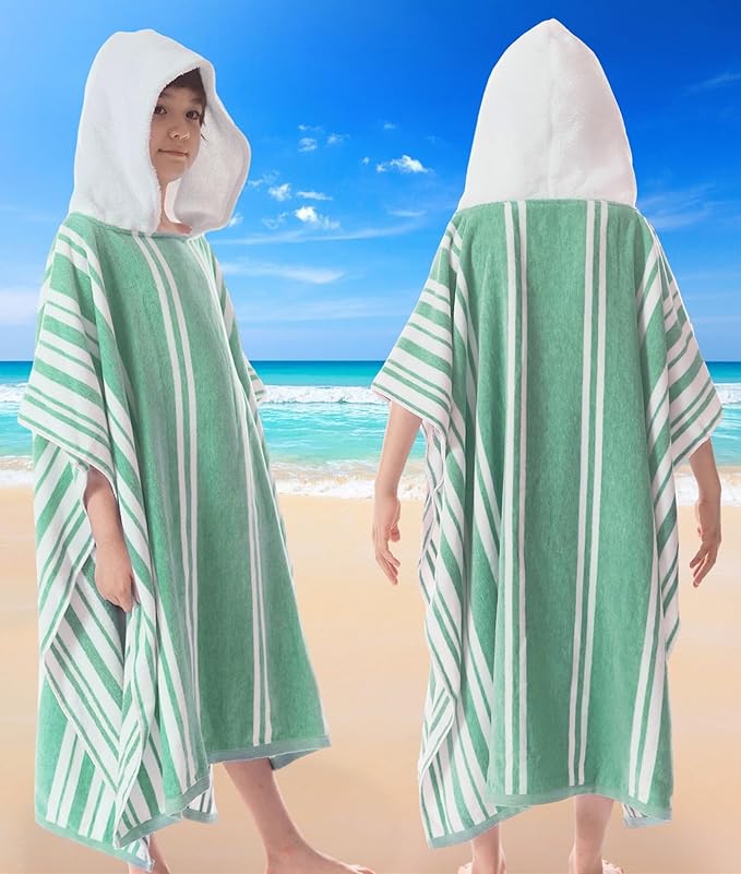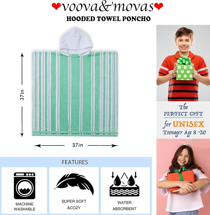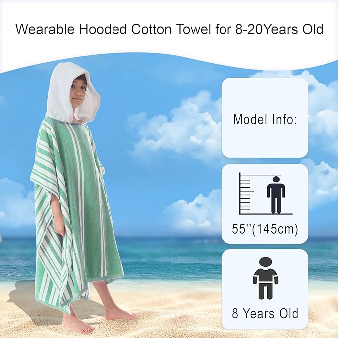VOOVA & MOVAS Hooded Beach Towels for Boys| Girls | Teens (8-16Years), 100% Cotton Thick Poncho Towel Robe for Big Kids, Perfect for Pool, Beach, Bath and Gifts, Green Cabana Stripe Design