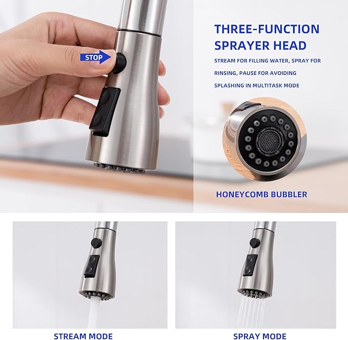 - Multi-Functional Pull-Down Sprayer: Our faucet's multi-functional pull-down spray head is a game-changer. Effortlessly switch between two modes - the gentle inflatable water flow for delicate washing and the powerful jet for efficient rinsing. The 17-inch pull-out hose offers a wide range of motion, making cleaning a breeze.