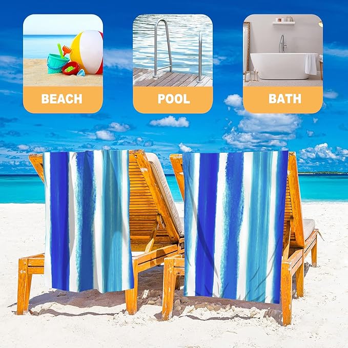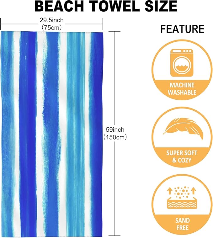 Beach Towel Oversized, Watercolor Blue Stripes Microfiber Beach Towels, Lightweight, Absorbent, Quick Dry, Sand-Free Beach Blanket, Unique and Ideal Gift for Camping, Pool,Yoga, 29.5” X 59”