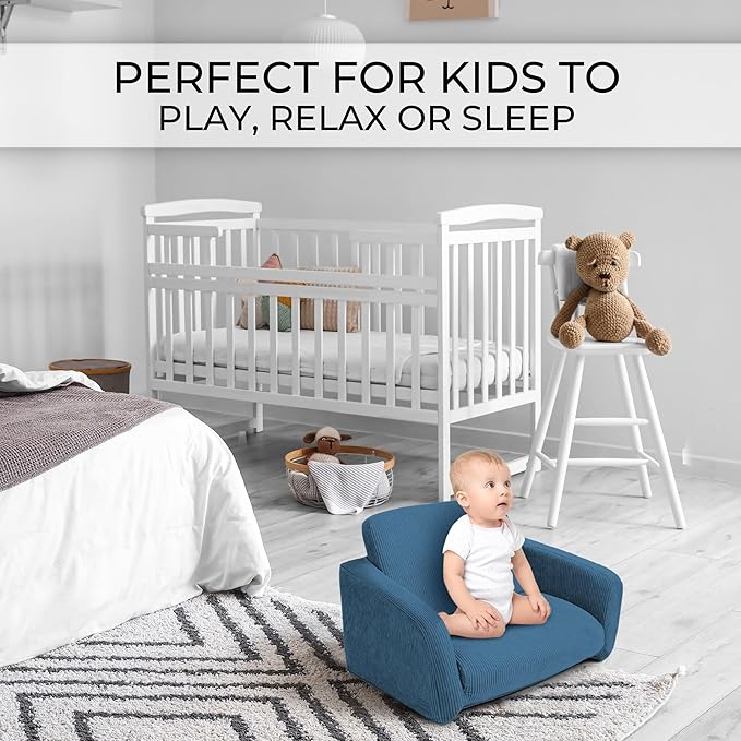 - Stylish 2-in-1 Convertible Feature: Your kids will simply love the kids sofa (recommended age: 18+ months)! Chic in stylish blue, the 22x16.5x15” kids couch delights with its double duty: easily switch from chair into a snug lounge position (22x41x11.5”)
