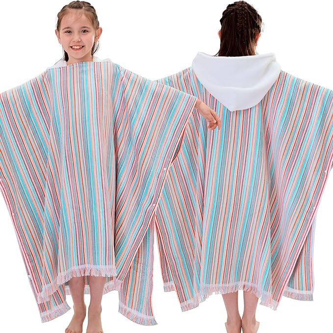 VOOVA & MOVAS Hooded Beach Towel for Big Kids | Large (8-16Years) Soft and Absorbent Cotton Poncho Towel Robe for Pool, Swim, and Bath, Rainbow