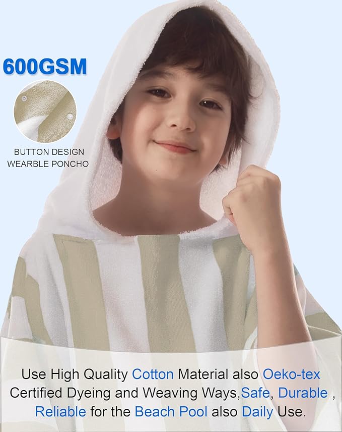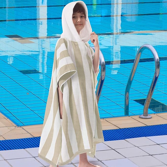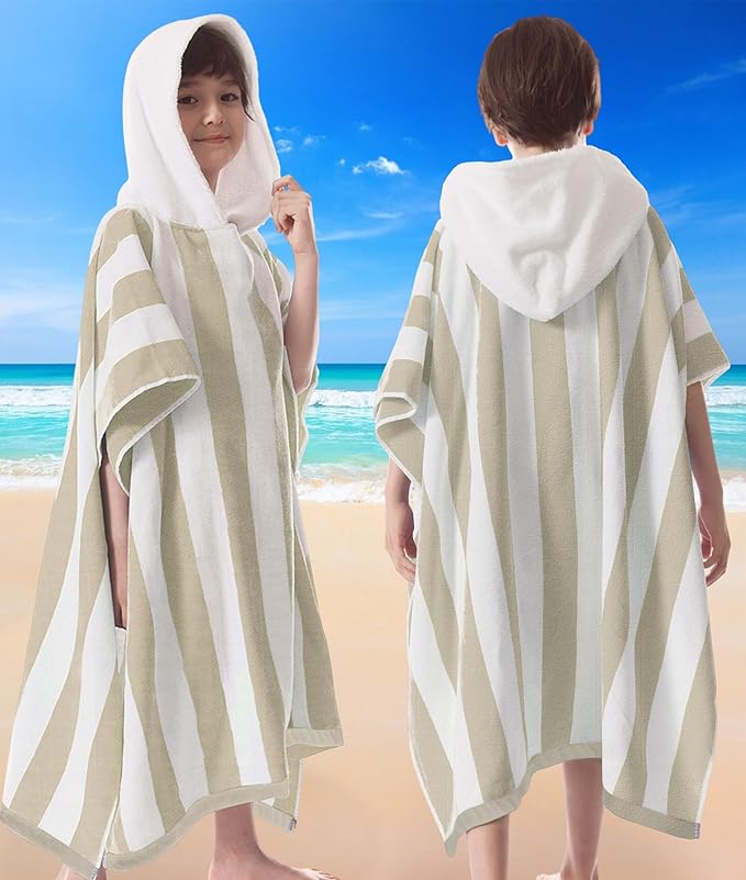 VOOVA & MOVAS Hooded Beach Towel for Big Kids | Large (8-16Years) Soft and Absorbent Cotton Poncho Towel Robe for Pool, Swim, and Bath, Tan Cabana Stripe