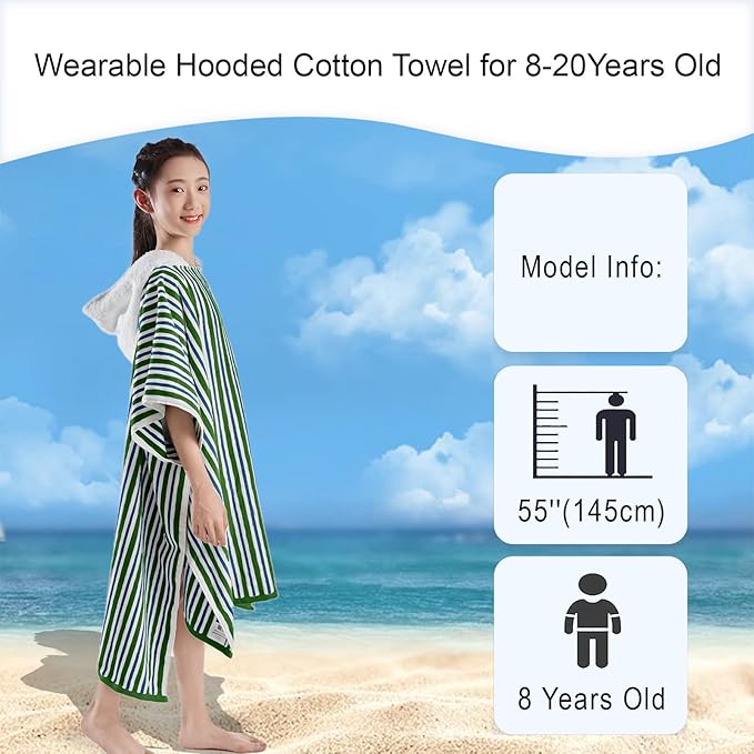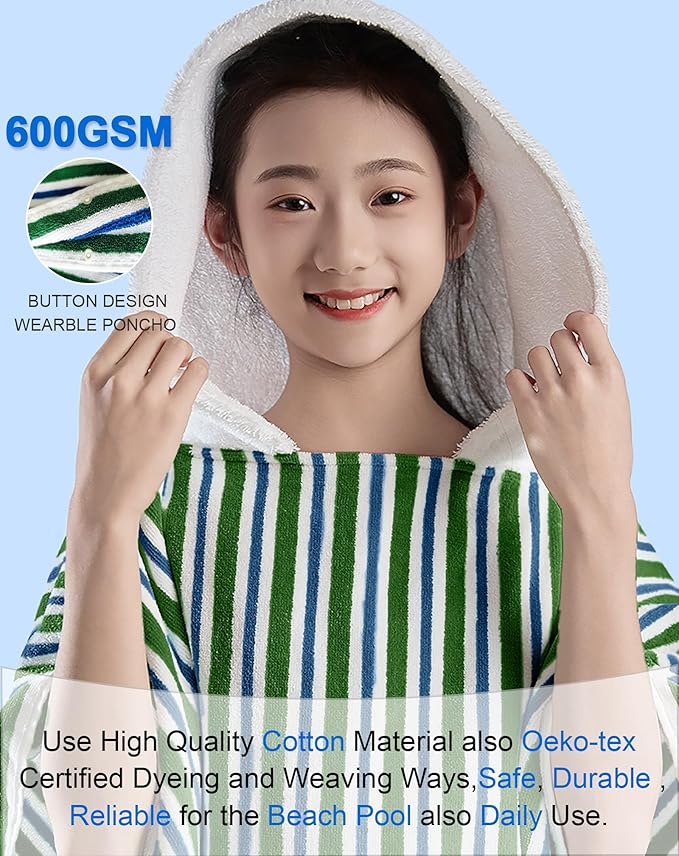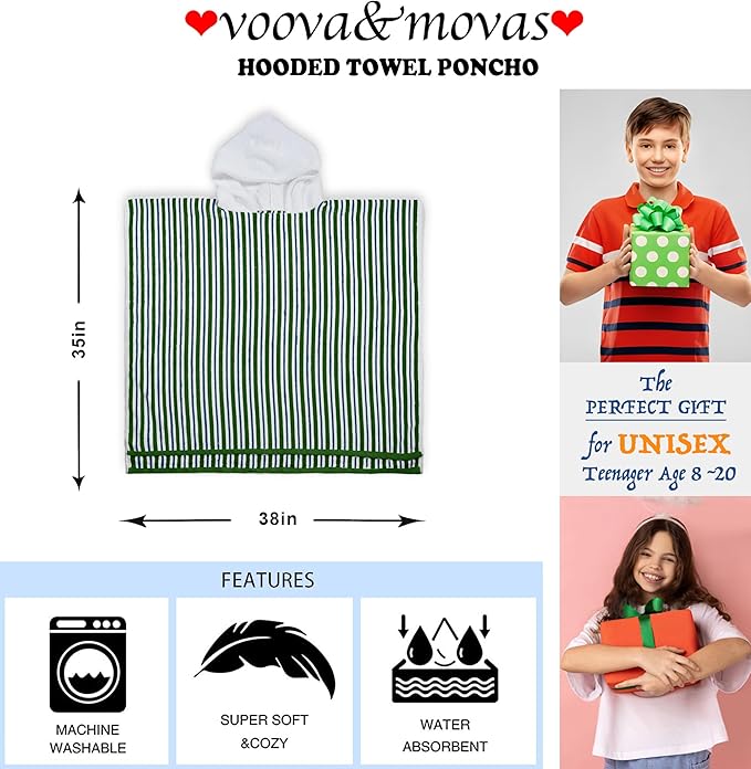 VOOVA & MOVAS Big Kids Hooded Towel Poncho | Large, Soft, Absorbent Cotton | 8-16 Years | Versatile for Pool, Swim,Beach and Bathroom | Navy Blue&Green