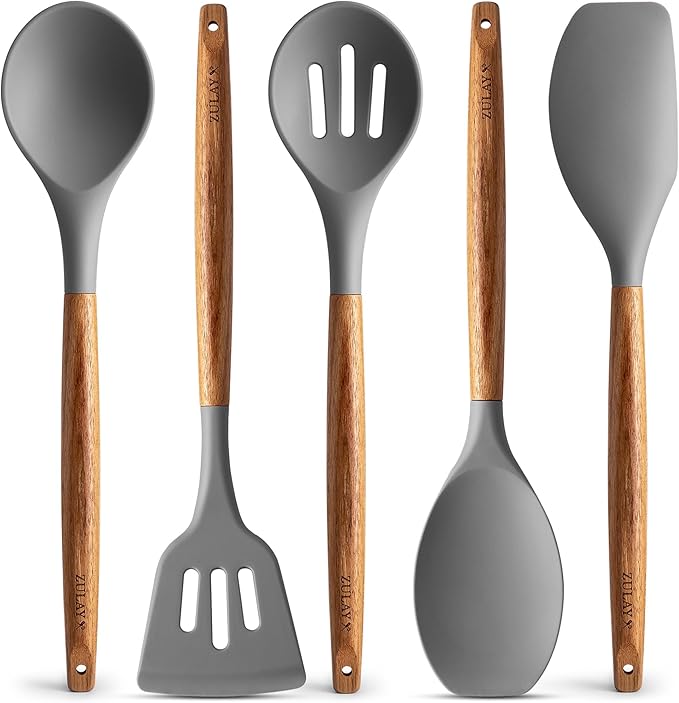 Zulay Kitchen Utensils Set Non-Stick Silicone Cooking Utensils Set with Authentic Acacia Wood Handles - 5 Piece Silicone Utensil Set - Silicone Kitchen Utensils Set with 464°F Heat Resistance - Gray