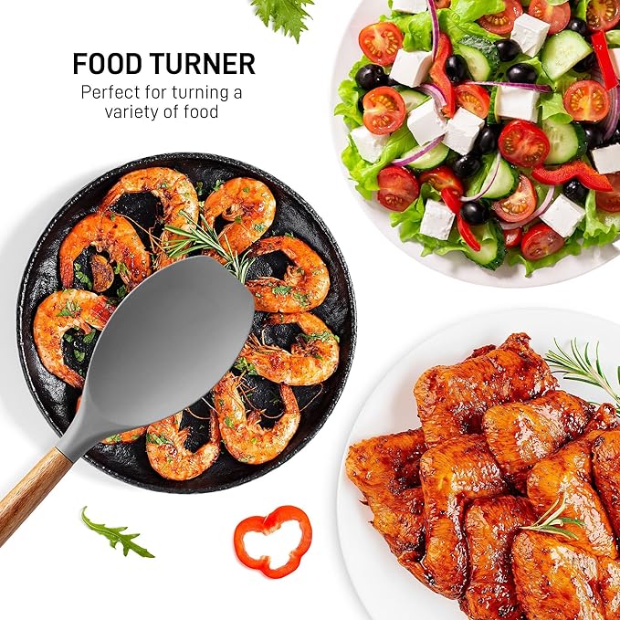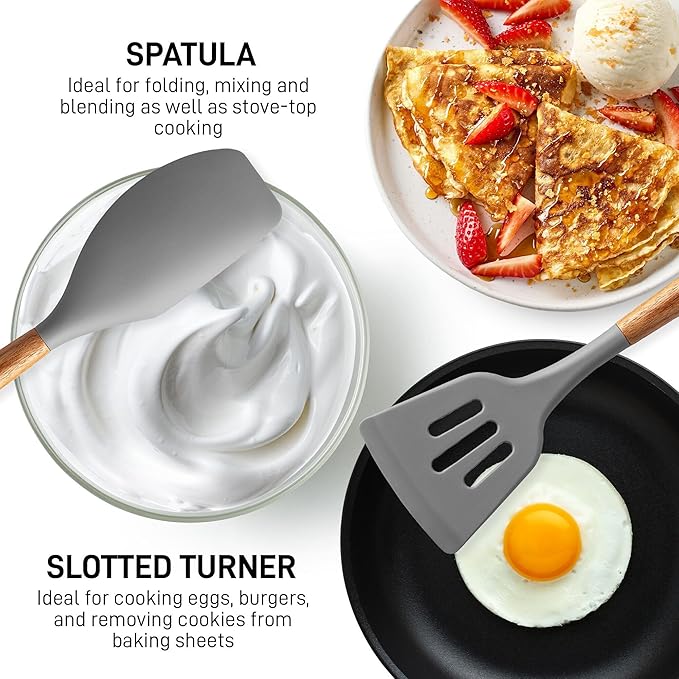 - PREMIUM QUALITY THAT LASTS: These kitchen utensils are made of food-grade silicone with a heat resistance of up to 464°F, making these ideal for stirring food in hot pans. The handles are crafted from authentic acacia hardwood, perfect for long-term use.