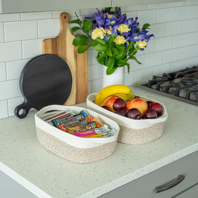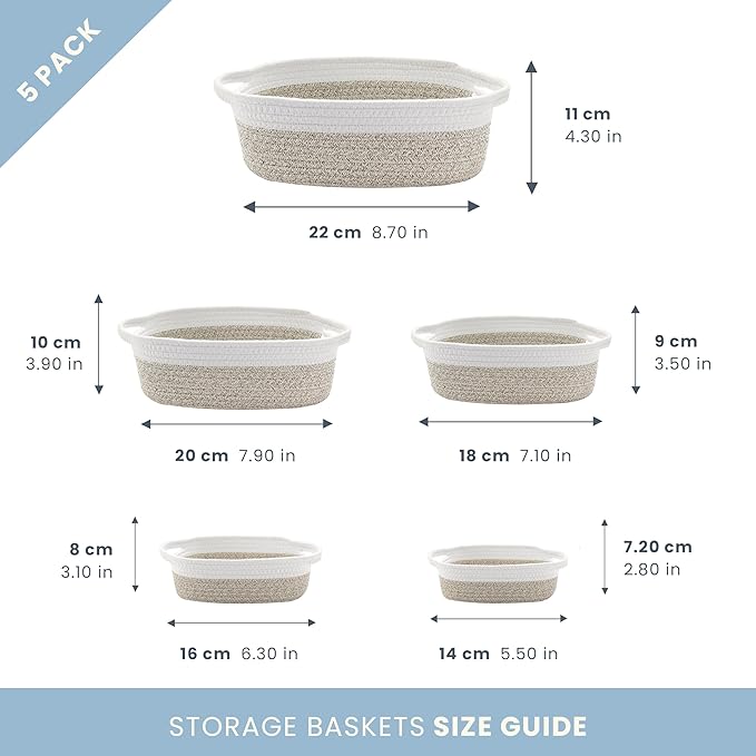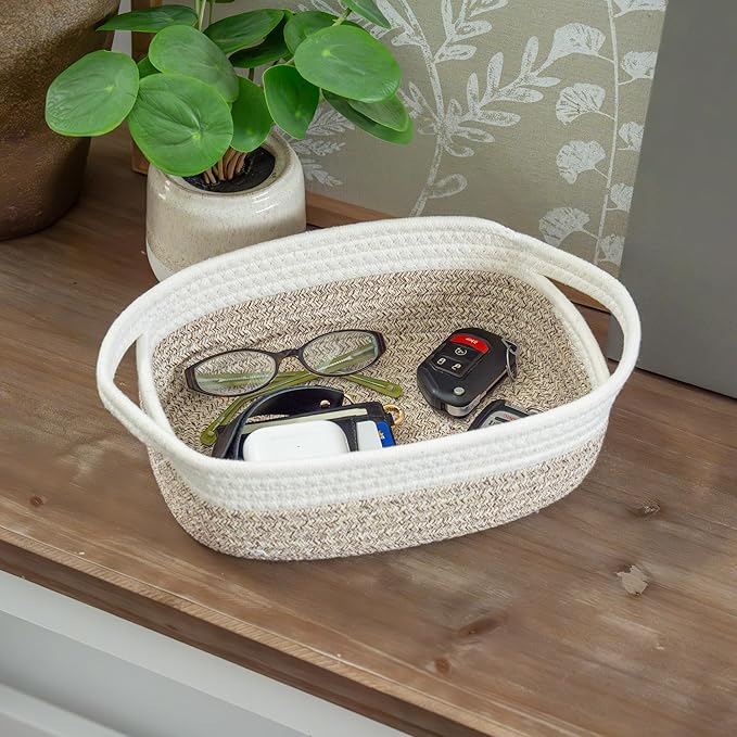 - Premium Woven Cotton Rope Baskets: These beautiful small rope baskets for bathroom provide just the right depth for displaying home decor in a kitchen, storing hand towels in the bathroom, as a baby basket organizer for nursery decor, or as a front entry catch-all.