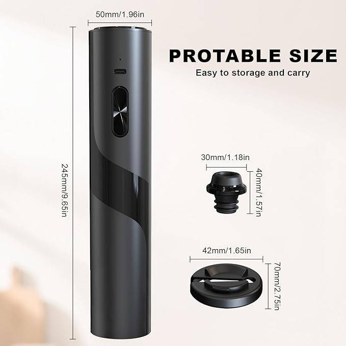 - 🍷【VACUUM PUMP】Vacuuming at the top and Opening at the bottom. The creative 2-in-1 design integrates an electric wine opener and an electric vacuum pump. The spiral hook at the bottom can easily open wine, and the top could match with a wine stopper for vacuuming and preserving. lt’s dual purpose, efficient and convenient