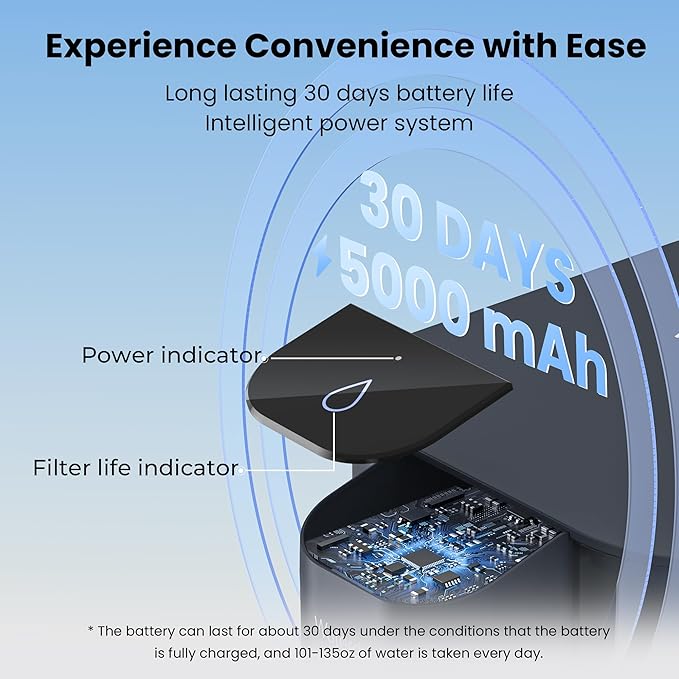 - [Safety performance] Electric water filter has passed the rigorous IPX5 high waterproof standard tests, confirming its safety for use in wet environments. The water-contacting components are made from BPA-free materials, ensuring that every drop of water is clean and safe for consumption.