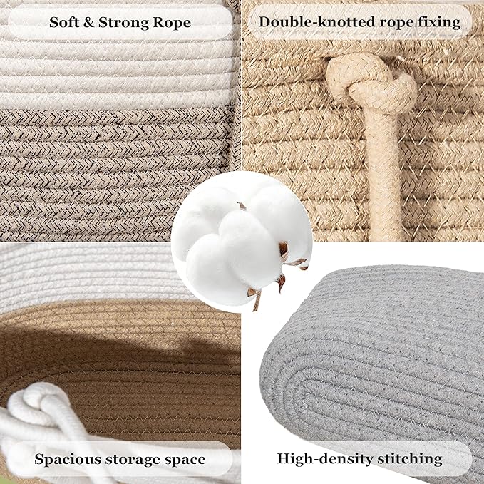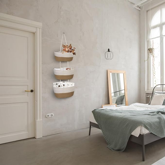 - STRING HANGING: Hanging storage baskets with spring steel hooks are designed in a unique stacked storage way, which rationally utilizes vertical space and makes your home look organized. Wall-mounted rope baskets can help you create personalized home decor