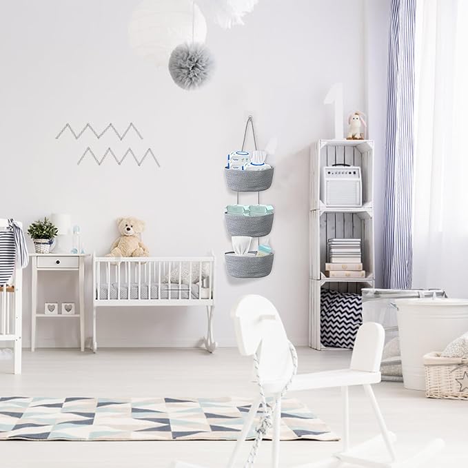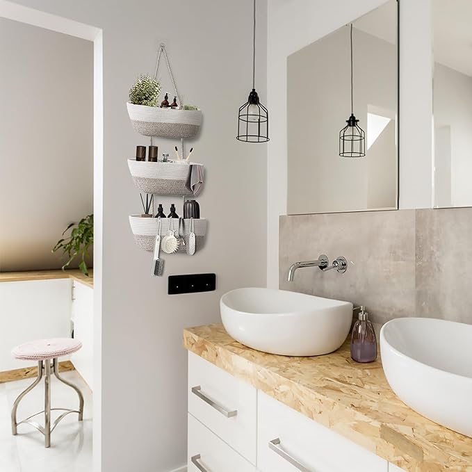 - STRING HANGING: Hanging storage baskets with spring steel hooks are designed in a unique stacked storage way, which rationally utilizes vertical space and makes your home look organized. Wall-mounted rope baskets can help you create personalized home decor