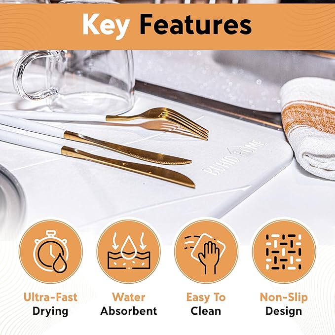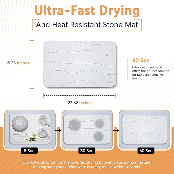 - ๐๐ฎ๐๐ ๐ง๐ผ ๐๐น๐ฒ๐ฎ๐ป: Say goodbye to traditional dish drying hassles with our stone mat. A simple wipe with a damp cloth or towel and a quick rinse ensures your kitchen stays hygienic and the mat is ready to use in minutes